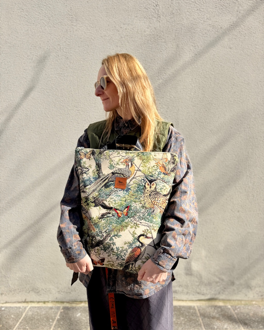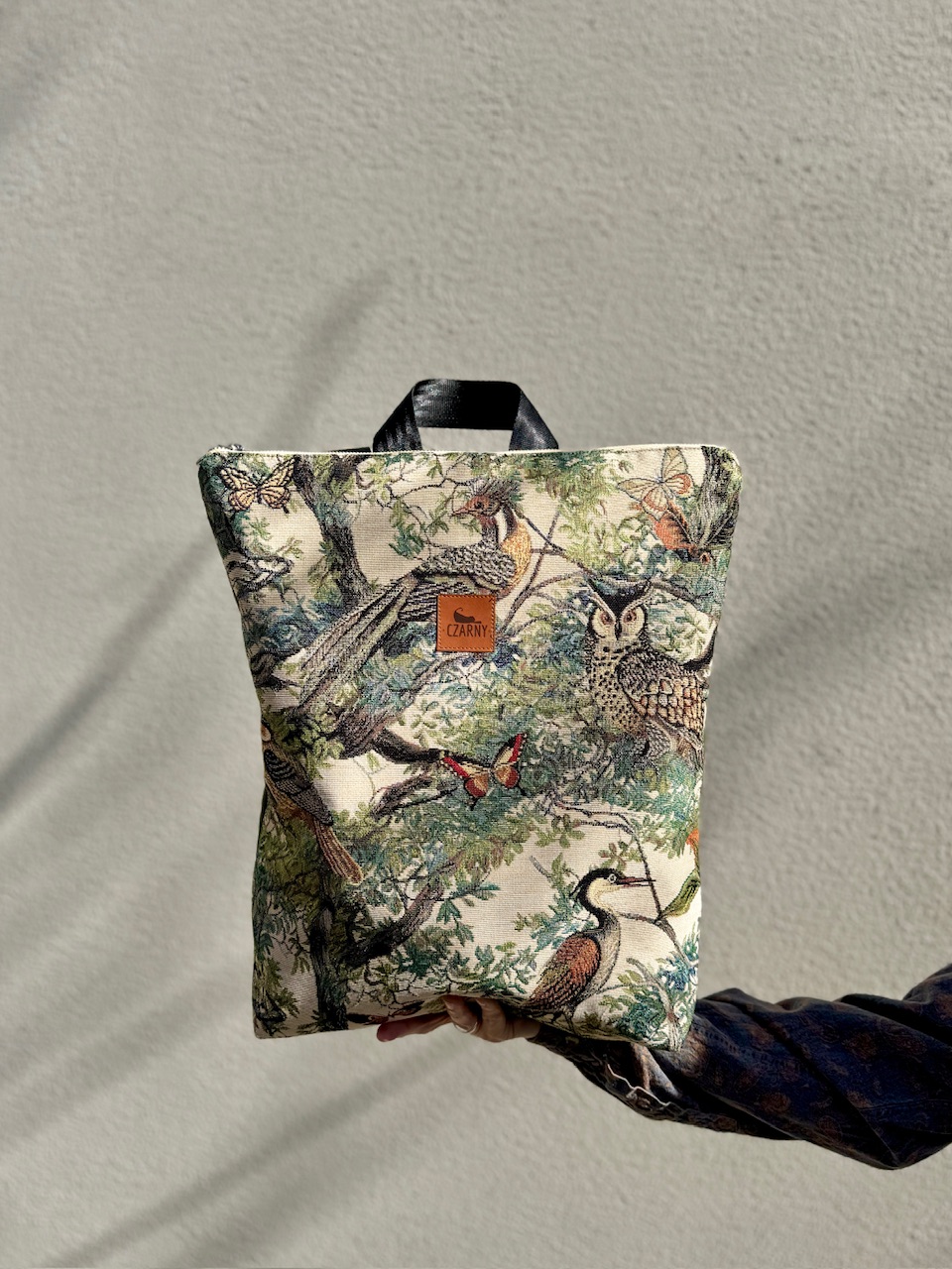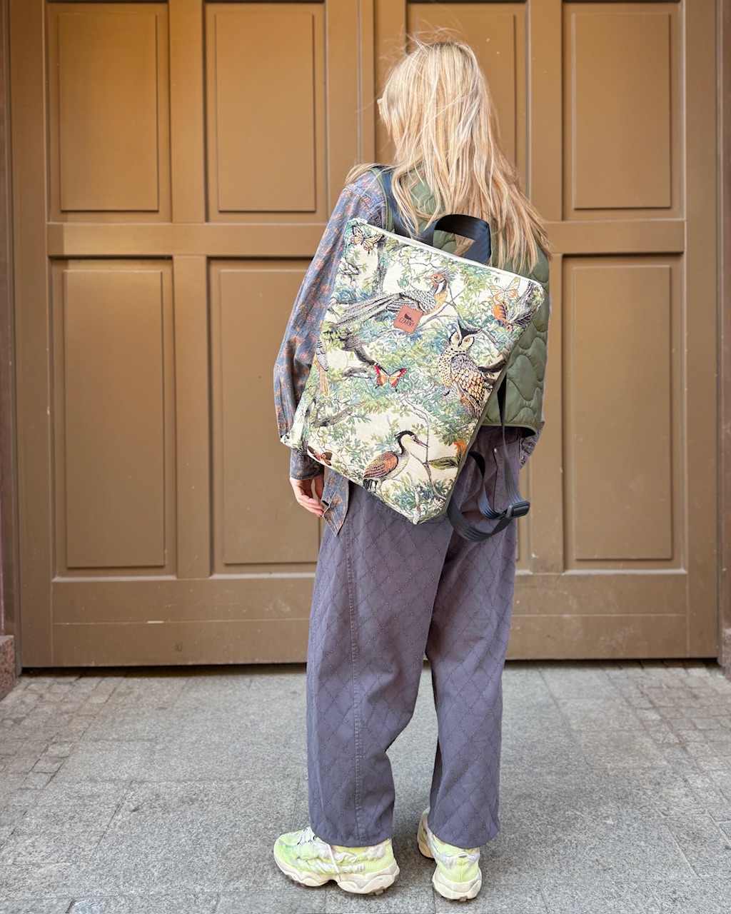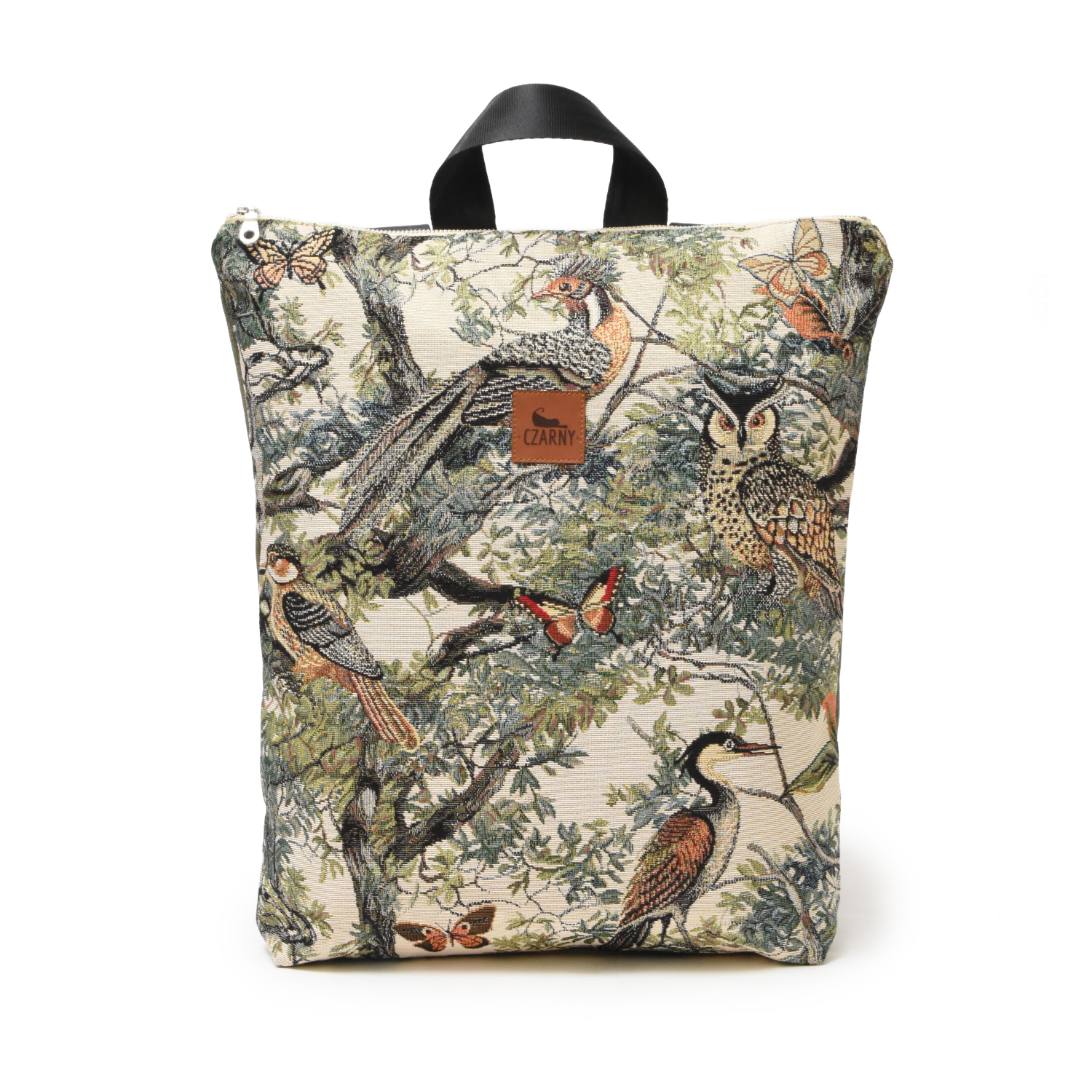Plecak wykonany z łączonych materiałów - przód plecaka stanowi gobelinowa tkanina premium z motywem ptaków i drzew. Z tyłu znajduje się warstwa grubej tkaniny w kolorze khaki.