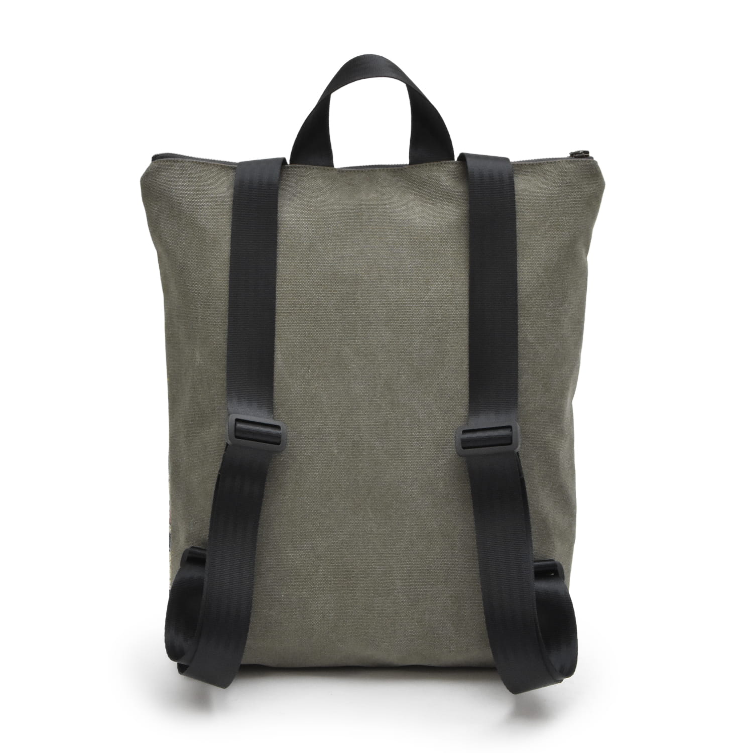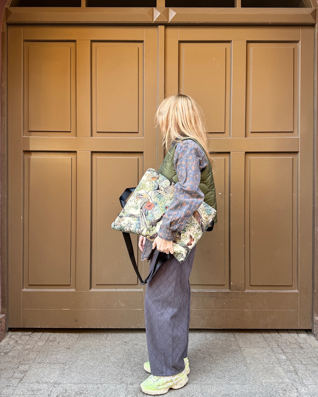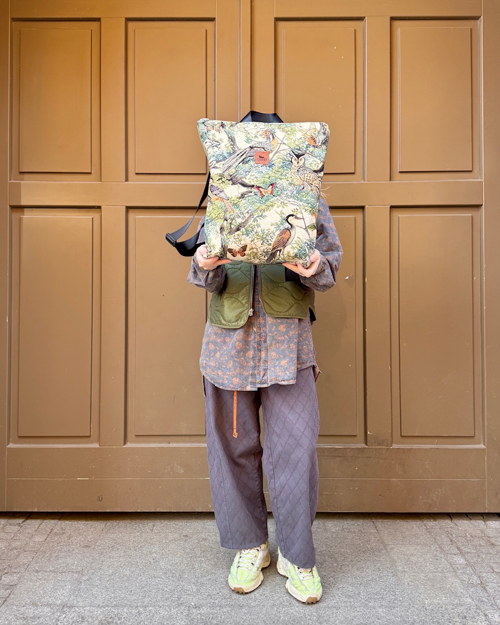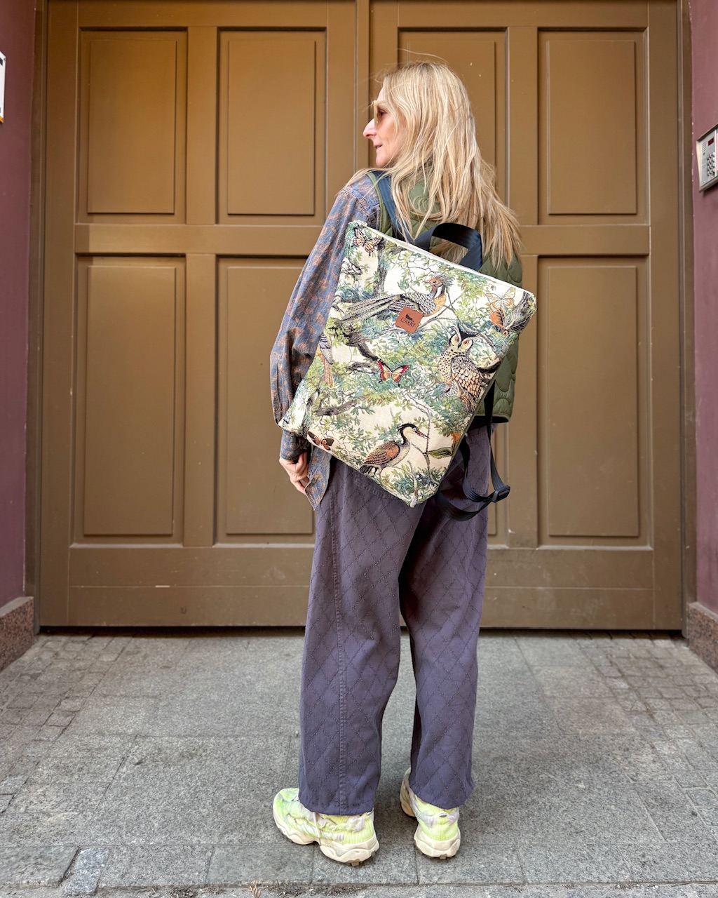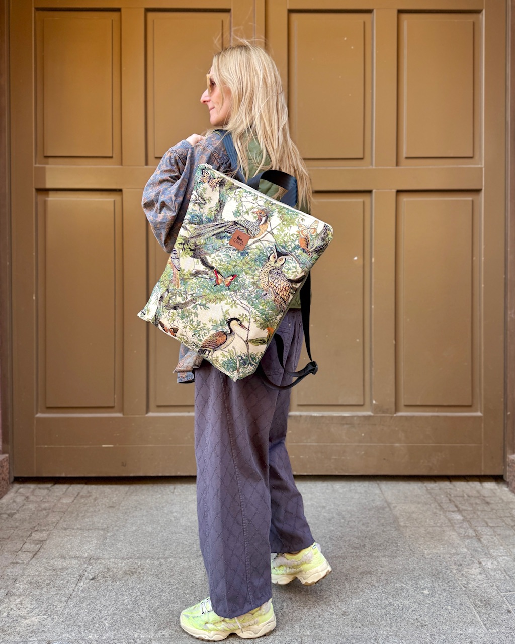Plecak wykonany z łączonych materiałów - przód plecaka stanowi gobelinowa tkanina premium z motywem ptaków i drzew. Z tyłu znajduje się warstwa grubej tkaniny w kolorze khaki.